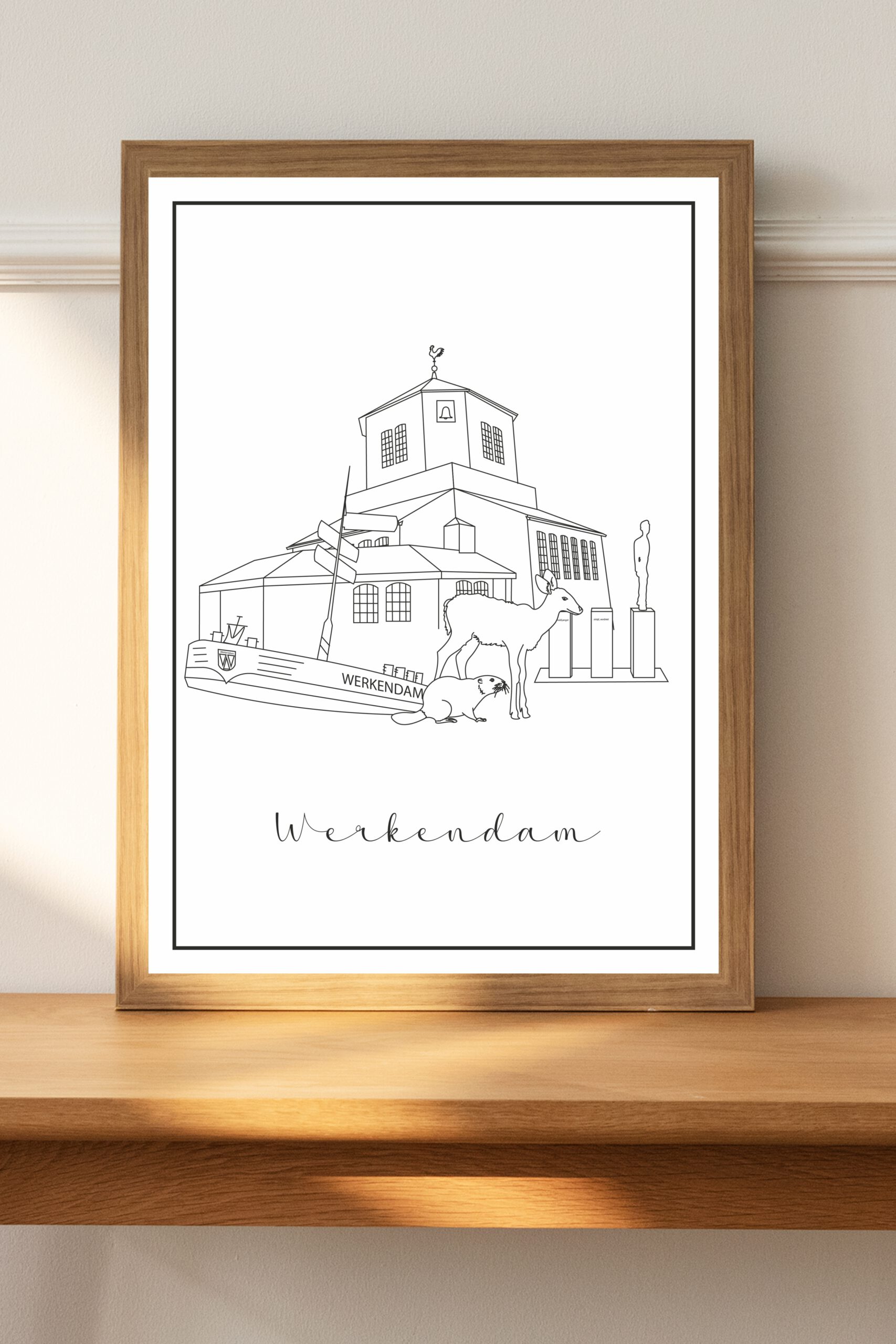 Deze poster laat Werkendam zien in een grafische illustratie met herkenbare gebouwen en elementen uit de omgeving.